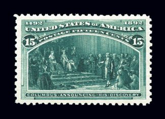 326 nh 238 image#238, 15c Columbian, a spectacular mint single that would please even the most demanding condition conscious collector, as this stamp's physical attributes are truly remarkable, being fabulously well centered amid lavishly large margins which are entirely atypical of this value, plus its color is especially intense and its impression is truly prooflike on immaculately white paper, unblemished o.g., never hinged, a superb gem; without question the finest mint Fifteen Cent Columbian to come on the market in years; 1992 and 2004 PF certificates, as well as a 2006 PSE certificate (XF-Superb 95 Jumbo; SMQ $3,800.00 as 95 and $8,000.00 as 98); this is the only example in the PSE population report awarded a 95J grade, and only one other has been graded higher. (Image) $750.00