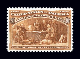 327 nh 239 image#239, 30c Columbian, brilliantly fresh, strikingly intense rich color and a well incised impression on immaculate paper, flawlessly centered within wide margins, wonderfully even and intact perforations all around, pristine o.g. without a single gum bend or skip, n.h., extremely fine; a gorgeous gem that is the epitome of perfection; 2002 PF certificate and a 2006 PSE certificate (XF-Superb 95; SMQ $4,600.00). (Image) $900.00