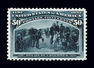 328 og 240 image#240, 50c Columbian, an extraordinarily choice mint example of this value, possessing outstanding overall freshness, with great color and impression on far brighter paper than usual, incredibly well centered within lavishly large margins which are most uncharacteristic, full clean o.g., very lightly hinged, extremely fine; Fifty Cent Columbians are seldom encountered in this gem condition; 1999 PF certificate and a 2006 PSE certificate (XF 90; SMQ $950.00). (Image) $600.00