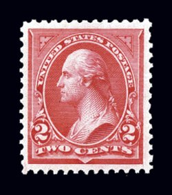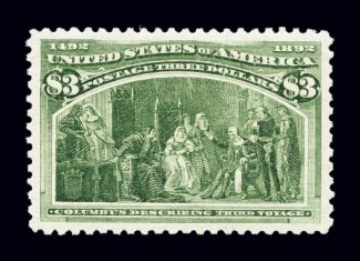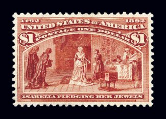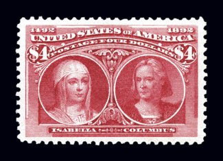 332 og 244 image#244, $4.00 Columbian, a phenomenal mint example boasting spectacular overall eye appeal, with lavish jumbo margins all around and being incredibly well centered within them, gloriously rich crimson lake color and a deeply etched impression on wonderfully fresh paper, unusually intact perforations all around, full clean o.g., lightly hinged, extremely fine gem; easily among the finest quality original gum Four Dollar Columbians in existence, with this being the only example graded 95J by the PSE (and only one other ranks higher); this striking stamp, when last sold in auction in the 2001 "Rarities of the World" auction conducted by Robert A. Siegel Auction Galleries, Inc., realized $9,350.00 (including premium); 2000 PF certificate and a 2006 PSE certificate (XF-Superb 95 Jumbo; SMQ $4,600.00 as 95 and $7,750.00 as 98). (Image) $2,600.00