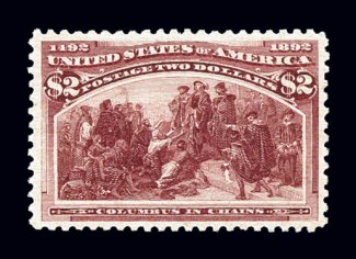 330 og 242 image#242, $2.00 Columbian, marvelously well centered within wide even margins, sumptuously rich color and impression on bright paper, especially clean full o.g., with just the barest trace of hinging, extremely fine; a remarkably choice and desirable original gum Two Dollar Columbian; 1985 PF certificate and a 2006 PSE certificate (XF 90; SMQ $2,250.00). (Image) $1,250.00