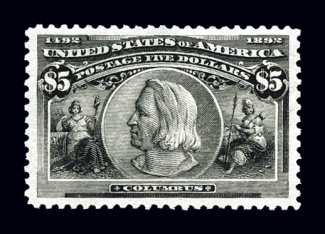 333 og 245 image#245, $5.00 Columbian, the mint example offered here of this always popular and desirable high value commemorative is one of the most eye-appealing we have ever had the pleasure to offer, as it boasts several uncommonly choice physical characteristics, not the least of which is its seldom seen overall brilliance and freshness, with truly prooflike color and a razor-sharp impression on bright white paper (not the toned paper so often encountered on this value), further enhancing its overall appeal is its virtually perfect centering amid the most lavishly large margins possible, and its reverse is just as impressive, boasting pristine full o.g. without a single gum bend or skip, with just the barest trace of hinging as well; one of the few truly superb original gum examples known; the perfect stamp for the collector assembling their dollar value Columbians one gem stamp at a time; 1988 PF certificate and a 2006 PSE certificate (XF-Superb 95 Jumbo; SMQ $8,800.00 as 95 and $13,600.00 as 98). (Image) $3,000.00