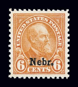 703 nh 675 image#675, 6c "Nebr." ovpt., a phenomenal mint example sporting the largest margins possible and being absolutely perfectly centered within them, gorgeous vibrant color, even its perforations are extraordinary - long and even all around, immaculate o.g., n.h., simply superb; 2006 PSE certificate (Superb 98 Jumbo; SMQ $1,100.00 as 98); this matchless gem is the highest graded Scott #675 in the PSE population report, and the sole example to have been given this lofty grade. (Image) $75.00