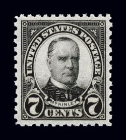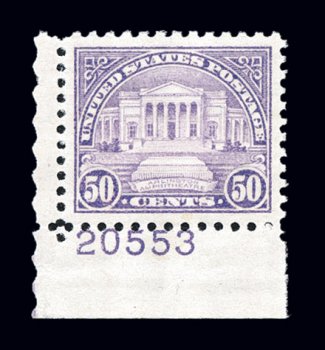 708 nh 701 image#701, 50c Lilac, a breathtaking bottom left corner sheet-margin plate no. 20553 single, possessing not only the widest margins possible for a rotary press issue, but it is absolutely perfectly centered within these impressive margins, brilliant overall freshness and color, pristine o.g., n.h., superb; a "one-in-a-million" gem that has been awarded the most coveted grade possible - Gem 100 Jumbo - by the PSE, the sole such example in their population report for Scott #701; 2006 PSE certificate (Gem 100 Jumbo; SMQ $460.00 as 98, unpriced in this stunning grade). (Image) $52.50