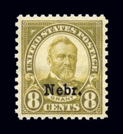 705 nh 677 image#677, 8c "Nebr." ovpt., extraordinarily well centered within unusually wide margins, brilliantly fresh color, o.g., n.h., extremely fine gem; 1998 PF certificate and a 2006 PSE certificate (XF-Superb 95; SMQ $435.00); this is one of only three examples to grade XF-Superb 95, the highest grade yet awarded to Scott #677; ex-Pietsch. (Image) $62.50