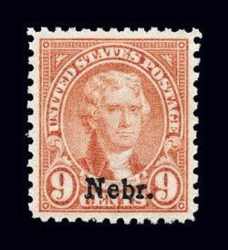 706 nh 678 image#678, 9c "Nebr." ovpt., precisely centered within large margins, rich luxuriant color, pristine o.g., n.h., extremely fine gem; an incredibly difficult value to obtain so perfectly centered; 1998 PF certificate and a 2006 PSE certificate (Superb 98; SMQ $1,050.00); one of only three to have been graded Superb 98 by the PSE, the highest grade assigned to any Scott #678; ex-Pietsch. (Image) $67.50