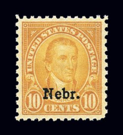 707 nh 679 image#679, 10c "Nebr." ovpt., marvelously well centered amid extravagantly large margins, beautifully fresh and vibrant color, o.g., n.h., extremely fine; a large-margined gem; 1997 PF certificate and a 2006 PSE certificate (XF-Superb 95; SMQ $790.00). (Image) $230.00