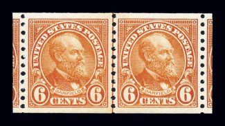 709 nh 723 image#723, 6c Deep orange coil, perf. 10 vert., gem line pair, cut from the coil roll so that portions of the adjoining stamps appear at each end of pair, flawlessly centered, brilliant color, o.g., n.h., extremely fine; 2006 PSE certificate (XF-Superb 95; SMQ unpriced). (Image) $82.50