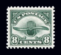 718 nh C4 image#C4, 8c Dark green, flawless mint single, precisely centered within very large margins, prooflike color and impression on immaculate paper, unblemished o.g. without any of the usual gum bends or skips, n.h., superb gem; 2000 PF certificate for a block of four, this being the top left stamp, as well as a 2006 PSE certificate (Superb 98; SMQ $365.00). (Image) $40.00