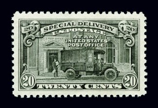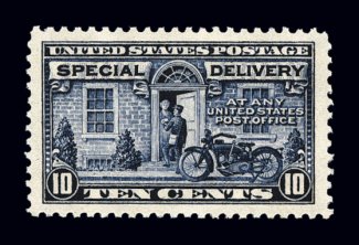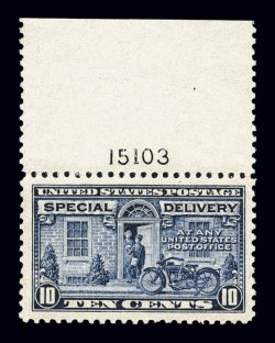 742 nh E12a image#E12a, 10c Deep ultramarine, an eye-arresting top sheet-margin plate no. 15103 single, boasting lavishly large and wonderfully well balanced margins all around, rich luxuriant color and a crisp detailed impression, o.g., n.h., an extremely fine gem; 2005 PF certificate and a 2006 PSE certificate (XF 90; SMQ $220.00). (Image) $100.00