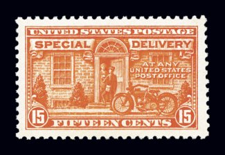 743 nh E13 image#E13, 15c Deep orange, a visually stunning mint example, possessing absolutely spectacualr color that could not be more intense or vibrant, plus it also features enormous jumbo margins and is perfectly centered within them, pristine o.g., n.h., extremely fine gem; a most remarkable stamp; 1994 and 2001 PF certificates, as well as a 2006 PSE certificate (Superb 98 Jumbo; SMQ $270.00 as 98); the only Scott #E13 to have been awarded this exalted grade; ex-"Piedmont". (Image) $50.00