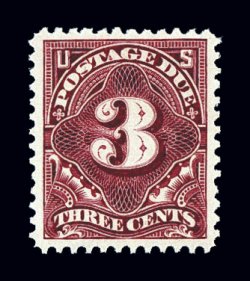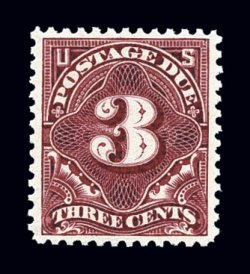 748 nh J33 image#J33, 3c Deep claret, a brilliant "post office" fresh mint example of this scarce and difficult value, featuring gloriously intense color and a razor-sharp impression on incredibly bright paper, exceedingly well centered within uncharacteristically large margins, pristine o.g., n.h., extremely fine; a truly rare stamp in this gem never hinged condition; 2004 and 2006 PF certificates (the latter graded XF 90; SMQ $1,750.00). (Image) $475.00