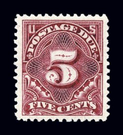 755 nh J41 image#J41, 5c Deep claret, a stunning jumbo-margined mint single, sporting huge margins all around and being perfectly centered within them, rich luxuriant color and a crisp detailed impression on bright paper, pristine o.g., n.h., extremely fine gem; a superb stamp for the collector who seeks out stamps of extraordinary quality; photocopy of a 1990 PF certificate for a plate block of six from which this stamp was taken, as well as a 2006 PSE certificate for the single (Superb 98; SMQ $1,450.00); the highest graded example in the PSE population report, being one of only two to have received this impressive grade. (Image) $230.00