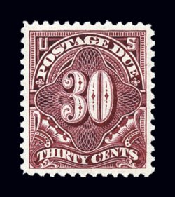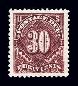 751 og J36 image#J36, 30c Deep claret, a phenomenal mint example that possesses, without fear of being contradicted, the most enormous margins of any existing example, and just as incredible is the fact that it is perfectly centered amid these massive margins, sumptuously rich color and a well incised impression on bright paper, o.g., lightly hinged, superb; a most remarkable stamp; 2004 PF certificate and a 2006 PSE certificate (Superb 98 Jumbo; SMQ unpriced in this grade, $1,250.00 as 95); this is the highest graded example, by far, in the PSE population report and the sole example to have been given this remarkable grade. (Image) $525.00