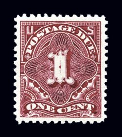 756 nh J42 image#J42, 10c Deep claret, lovely top sheet-margin partial imprint single, impeccably centered within large margins, especially deep color and a well etched impression on pristine paper, o.g., n.h., extremely fine; rarely encountered in this gem condition, particularly never hinged; 2001 PF certificate for a strip of three from which this stamp was taken, as well as a 2006 PSE certificate as a single (XF-Superb 95; SMQ $900.00); the highest grade yet assigned to Scott #J42, and the sole example to have been given this grade. (Image) $230.00
