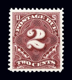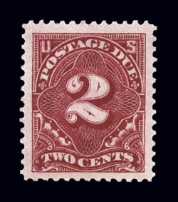 753 nh J39 image#J39, 2c Deep claret, magnificent quality mint single, incredibly large and perfectly balanced margins all around, lovely rich color and a razor-sharp impression on brilliantly fresh paper, immaculate o.g., n.h., extremely fine gem; actually a very scarce and desirable stamp in this superb condition; 2006 PSE certificate (Superb 98; SMQ $460.00); the highest grade assigned to any example of Scott #J39. (Image) $27.50