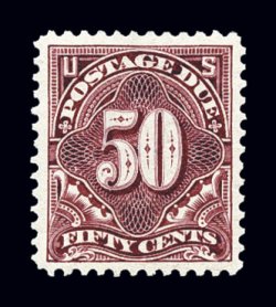 758 og J44 image#J44, 50c Deep claret, near perfect centering within extraordinarily wide margins, lovely rich color and a deeply etched impression, o.g., very lightly hinged, extremely fine; a remarkably scarce and challenging stamp to find in this gem quality; 1998 PF certificate and a 2006 PSE certificate (XF-Superb 95; SMQ $1,100.00); the highest grade assigned to this stamp by the PSE, being one of only two so graded. (Image) $425.00