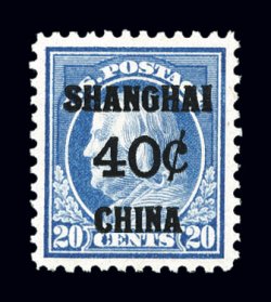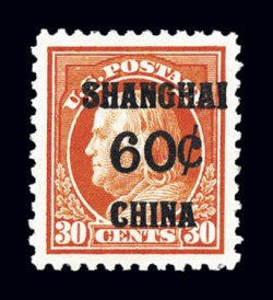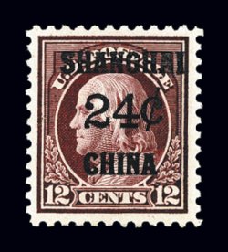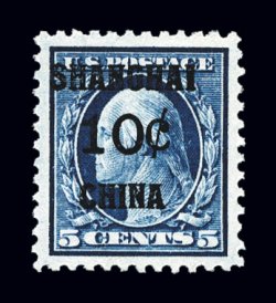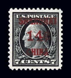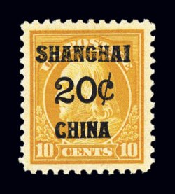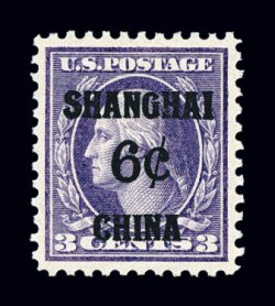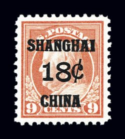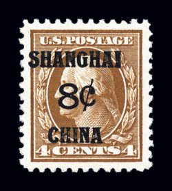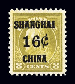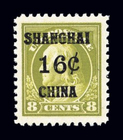 788 nh K8a image#K8a, 16c on 8c Olive green, the mint example offered here as to qualify as the most spectacular quality Shanghai overprint in existence, as each aspect of this stunning stamp could not be more impressive, not the least of which is its flawless centering amid the most gigantic jumbo margins imaginable, plus it possesses an incredible overall brilliance, with sumptuously rich color and a strong impression on brilliantly fresh paper, o.g., n.h., superb; quite likely the finest example of this stamp extant; 1992 and 2006 PF certificates (the latter graded Superb 98 Jumbo; SMQ $2,050.00 as 98). (Image) $150.00