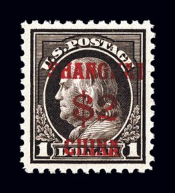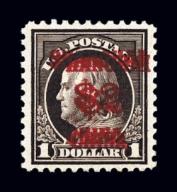 799 og K16a image#K16a, $2.00 on $1.00 Violet brown, double surcharge, a magnificent quality mint example of this popular error rarity, possessing outstanding centering amid unusually large margins, plus its color and impression could not be more intense, the doubling of the surcharge is strong and distinct, substantially spaced from one another as opposed to some existing copies whose two surcharges almost fall on top of one another, full o.g., lightly hinged, extremely fine; only one sheet of the double surcharge was ever found, with this being among the finest quality examples from the unique sheet; 1968 PF certificate for a block of four, this being the bottom right stamp, as well as 2006 PSE certificate for the single (VF 80; unlisted in SMQ); ex-Drucker. (Image) $7,250.00