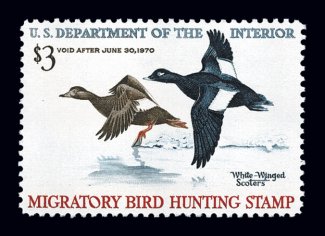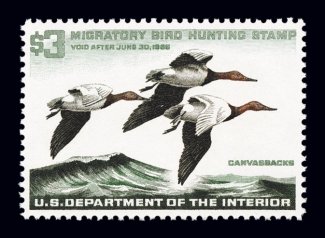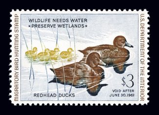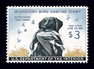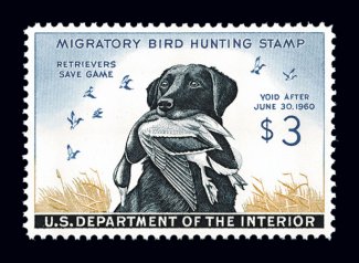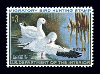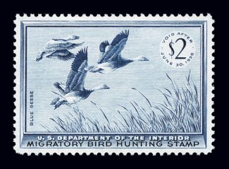 846 nh RW26 image#RW26, 1959 $3.00 Blue, ochre and black, exceedingly well centered within large margins, fresh, o.g., n.h., an extremely fine gem; 2004 PSE certificate (XF-Superb 95; SMQ $205.00). (Image) $120.00