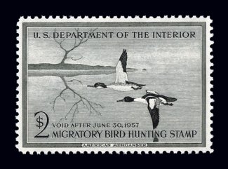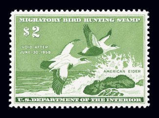 843 nh RW24 image#RW24, 1957 $2.00 Emerald, highly select mint example, possessing uncharacteristically large margins and being wonderfully well centered within them, strong color, o.g., n.h., extremely fine gem; 2004 PSE certificate (XF-Superb 95; SMQ $205.00). (Image) $85.00