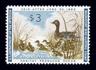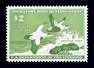 850 nh RW29 image#RW29, 1962 $3.00 Multicolored, unusually large and perfectly balanced margins all around, o.g., n.h., extremely fine gem; 2006 PSE certificate (XF-Superb 95; SMQ $200.00). (Image) $110.00