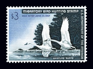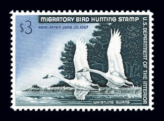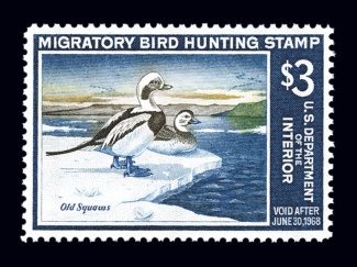 856 nh RW34 image#RW34, 1967 $3.00 Multicolored, large well balanced margins, rich colors, o.g., n.h., extremely fine and quite choice; 2006 PSE certificate (XF 90; SMQ $180.00). (Image) $125.00