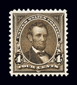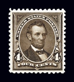 359 og 269 image#269, 4c Dark brown, near perfect centering within uncharacteristically large margins, prooflike color and impression on pristine paper, o.g., barest trace of a hinge mark, extremely fine gem; 1997 PF certificate ("never hinged") and a 2006 PSE certificate (XF 90; SMQ $105.00). (Image) $50.00