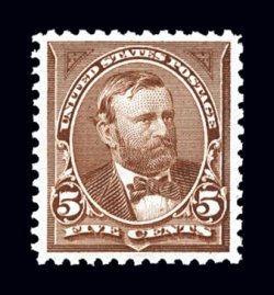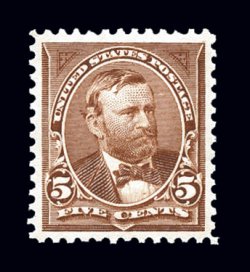 344 nh 255 image#255, 5c Chocolate, choice mint single, marvelously well centered within large margins, sumptuously rich color and a strong impression, pristine o.g., n.h., extremely fine; a surprisingly difficult stamp to find in this premium never hinged condition; 2000 PF certificate and a 2006 PSE certificate (XF 90; SMQ $950.00). (Image) $375.00