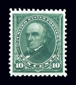 347 nh 258 image#258, 10c Dark green, exceedingly well centered within wide margins which are most uncharacteristic of this particular value, sumptuously rich color and a strong impression, pristine o.g., n.h., a single short perf. at top right is the only thing separating this stamp from the gem category, otherwise extremely fine; 1994 (as a block) and 2000 PF certificates, as well as a 2006 PSE certificate (VF-XF 85; SMQ $1,400.00). (Image) $900.00
