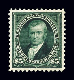 368 og 278 image#278, $5.00 Dark green, an eye-arresting mint example of this rare and difficult high value, possessing absolutely huge margins for this typically tightly margined issue, and being virtually flawlessly centered within these impressive borders, even its color is out of the ordinary, as it is incredibly deep and luxuriant, full o.g, lightly hinged, an extremely fine gem for the collector who seeks out truly exceptional quality stamps; 1970 and 1996 PF certificates, as well as a 2006 PSE certificate (XF-Superb 95; SMQ $6,950.00). (Image) $2,400.00