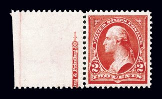 370 nh 279B image#279B, 2c Red, Ty. IV, left sheet-margin partial imprint single, extravagantly large and well balanced margins all around, radiant color and a crisp detailed impression, immaculate o.g., n.h., extremely fine gem; 1998 PF certificate and a 2006 PSE certificate (XF 90; SMQ $115.00); ex-Pietsch. (Image) $22.00