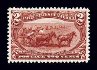 379 nh 286 image#286, 2c Trans-Mississippi, a matchless quality mint example, with each aspect of this remarkable stamp being absolute perfection, including its mathematically precise centering amid the most enormous margins possible, plus its color could not be more intense nor impression more sharply detailed on fabulously fresh paper, even its perforations are especially large and uniformly intact all around, unblemished o.g., n.h., superb; this stunning stamp will undoubtedly realize a record price and deservedly so; 1997 PF certificate and a 2006 PSE certificate (Superb 98 Jumbo; SMQ $1,500.00 as 98); the highest graded example in the PSE population report and the sole example to have been awarded this impressive grade. (Image) $75.00