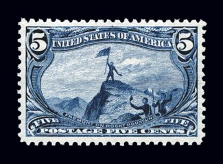 380 nh 288 image#288, 5c Trans-Mississippi, incredibly well centered within very large margins, deep luxuriant color and a crisp detailed impression on bright fresh paper, o.g., n.h., extremely fine; a gem example with great eye appeal; 1987 PF certificate (top sheet selvage subsequently removed), as well as a 2006 PSE certificate (XF-Superb 95; SMQ $2,600.00); ex-Welling, Higgins. (Image) $350.00