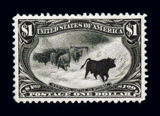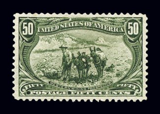 383 og 291 image#291, 50c Trans-Mississippi, an exceptional mint example of one of the most difficult stamps in the set to find in true gem quality, possessing an exceptional overall freshness and the most beautiful "sage" green color imaginable, plus its impression is highly detailed, marvelously well centered within large margins, full clean o.g., lightly hinged, extremely fine and striking; 1997 PF certificate and a 2006 PSE certificate (XF 90; SMQ $1,250.00). (Image) $700.00