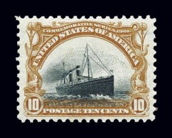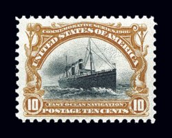 393 nh 299 image#299, 10c Pan-American, perfectly centered within large margins, deep rich colors, pristine o.g., n.h., extremely fine; in addition to being an exceptionally choice example, this particular copy also displays a strong downward shift of the central vignette, in effect creating a striking "sinking ship" variety; 2001 PF certificate for a block of four, this being the bottom right stamp, and a 2006 PSE certificate as a single (XF 90; SMQ $730.00). (Image) $375.00
