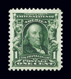 394 nh 300 image#300, 1c Blue green, an eye-arresting jumbo-margined mint single, with absolutely enormous and wonderfully well balanced margins all around, intensely rich color and impression, o.g., n.h., extremely fine; a spectacular gem; 2000 PF certificate and a 2006 PSE certificate (XF 90 Jumbo; SMQ $115.00 as 90 and $305.00 as 95). (Image) $27.50
