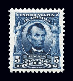 400 nh 304 image#304, 5c Blue, striking jumbo-margined mint single, boasting margins of a size unlike those found on any other example we have seen of this particular value, being extraordinarily well centered within these immense borders, truly prooflike color and impression on brilliantly fresh paper, pristine o.g., n.h., extremely fine gem; a most remarkable stamp; 1997 PF certificate and a 2006 PSE certificate (XF 90 Jumbo; SMQ $420.00 as 90 and $1,100.00 as 95). (Image) $140.00