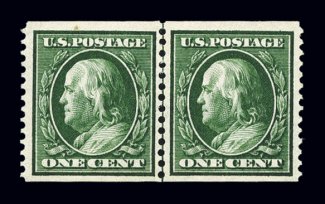441 og 352 image#352, 1c Green coil, perf. 12 vert., guide line pair, extraordinarily well centered for this scarce and challenging coil, deep luxuriant color and a well incised impression, o.g., lightly hinged, tiny spot in the top margin of the left stamp of little significance and not even mentioned on the accompanying PF certificates, very fine and quite choice; 1982 and 2000 PF certificates, as well as a 2006 PSE certificate (F-VF 75 - presumably due to the tiny spot; SMQ $450.00 for 70 and $900.00 for 80). (Image) $750.00