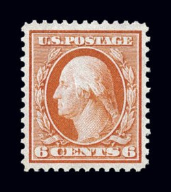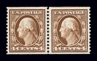 442 og 354 image#354, 4c Orange brown coil, perf. 12 vert., pair, 3mm spacing, extraordinarily well centered within uncharacteristically wide margins, rich luxuriant color and a strong impression, o.g., faintest trace of hinging, extremely fine; a particularly handsome pair of this scarce coil; 1999 PF certificate and a 2006 PSE certificate (XF 90; SMQ $860.00). (Image) $500.00