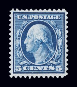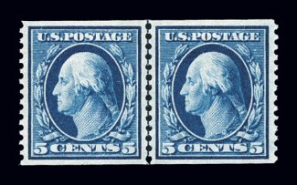 443 og 355 image#355, 5c Blue coil, perf. 12 vert., a remarkable quality guide line pair, featuring near perfect centering within large margins, but just as impressive is this pair's gorgeous intense color and razor-sharp impression on bright fresh paper, even the guide line is perfectly positioned between the stamps, o.g., lightly hinged, extremely fine; an especially rare and desirable coil line pair in this gem condition; 2001 PF certificate and a 2006 PSE certificate (XF 90; SMQ $2,300.00); this is the highest grade assigned to date for any line pair of Scott #355. (Image) $1,500.00