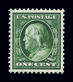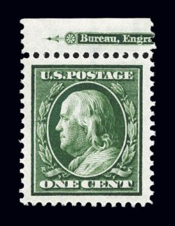 459 nh 374 image#374, 1c Green, an incomparable top sheet-margin partial imprint single, possessing the largest margins imaginable and being perfectly centered within them, truly prooflike color and impression, o.g., n.h., superb; a spectacular jumbo; 1999 PF certificate and a 2006 PSE certificate (Superb 98 Jumbo; SMQ $425.00 as 98); the sole example to grade Superb 98 Jumbo, the highest grade assigned to this stamp by the PSE. (Image) $15.00