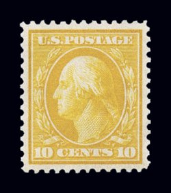 449 og 364 image#364, 10c Yellow on bluish paper, a truly gem mint example of this scarce and difficult bluish paper, incredibly well centered with perfectly balanced and uncharacteristically large margins all around, gorgeous intense color and impression, full clean o.g. with just the barest suggestion of a hinge mark, an extremely fine gem; without question the finest centered and margined Ten Cent Bluish Paper we have ever offered in our auctions; 1991 PF certificate and a 2006 PSE certificate (XF 90; SMQ $2,900.00). (Image) $1,900.00