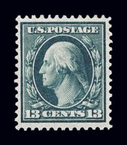 450 og 365 image#365, 13c Blue green on bluish paper, extraordinarily fresh and crisp, with lovely rich color and a razor-sharp impression on bright paper, exceptionally well centered and margined, full o.g., lightly hinged, very fine and wonderfully choice; a particularly handsome Thirteen Cent Bluish Paper; 1993 PF certificate and a 2006 PSE certificate (F-VF 75 - most would agree this is very conservatively graded by the PSE; SMQ $3,000.00 for an 80 grade, as the SMQ does not price stamps in the 75 grade). (Image) $3,000.00