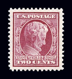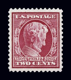 452 nh 367 image#367, 2c Lincoln, enormous perfectly balanced margins all around. radiant color and a crisp impression on brilliantly fresh paper, o.g., n.h., superb; an amazing jumbo example; 1995 PF certificate for a horizontal pair, this being the right stamp, plus a 2006 PSE certificate as a single (Superb 98; SMQ $175.00); this is one of three stamps graded Superb 98, the highest grade awarded by the PSE to a Two Cent 1909 Lincoln Commemorative. (Image) $11.00