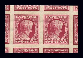 453 nh 368 image#368, 2c Lincoln imperforate, a spectacular horizontal pair, cut from the sheet so that is perfectly "framed" by large equal portions of all ten adjoining stamps, brilliantly fresh, deep rich color, o.g., n.h., extremely fine; an absolutely superb pair; 2006 PSE certificate. (Image) $85.00