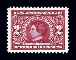 455 nh 370 image#370, 2c Alaska-Yukon, select mint single, marvelously well centered within exceptionally large margins, prooflike color and impression, pristine o.g., n.h., extremely fine gem; 1992 PF certificate for a vertical pair, this being the top stamp, as well as a 2006 PSE certificate for the single (XF-Superb 95; SMQ $110.00). (Image) $17.50