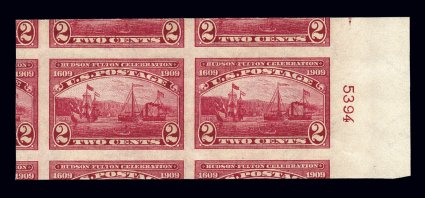 458 nh 373 image#373, 2c Hudson-Fulton imperforate, striking right sheet-margin plate no. 5394 horizontal pair, extracted from a plate block so that enormous equal portions of seven adjoining stamps appear, intense color and impression, brilliantly fresh, o.g., n.h., a superb pair; 2006 PSE certificate. (Image) $105.00