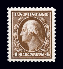 463 nh 377 image#377, 4c Brown, a gorgeous quality mint single, featuring spectacularly large and perfectly balanced margins all around, sumptuously rich color and a detailed impression on brilliantly white paper, uniformly even and intact perforations, unblemished o.g., n.h., superb; an incomparable gem with every physical attribute that the most demanding condition conscious collector could ask for; 1993 and 2006 PSE certificates (the latter graded Superb 98 Jumbo; SMQ $1,400.00 as 98); one of only three stamps graded Superb 98 Jumbo by the PSE, the highest grade awarded to this stamp; ex-Morris. (Image) $67.50
