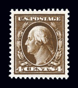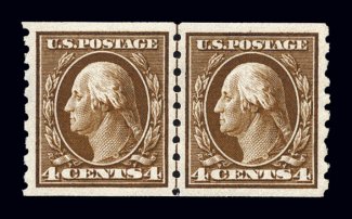 480 nh 395 image#395, 4c Brown coil, perf. 8 1/2 vert., an incomparable quality line pair of this scarce coil, being in a condition whose equal likely does not exist, featuring mathematically precise centering (on both stamps) within unusually large margins, plus its guide line is perfectly positioned between the two stamps, strikingly intense color and a prooflike impression on immaculate paper, pristine o.g., n.h., a superb coil line pair for the finest collection; 1990 PF certificate and a 2006 PSE certificate (Superb 98; SMQ $5,100.00); not only is the highest grade awarded to a line pair of this, this is the only example to have been given this remarkable designation. (Image) $1,100.00